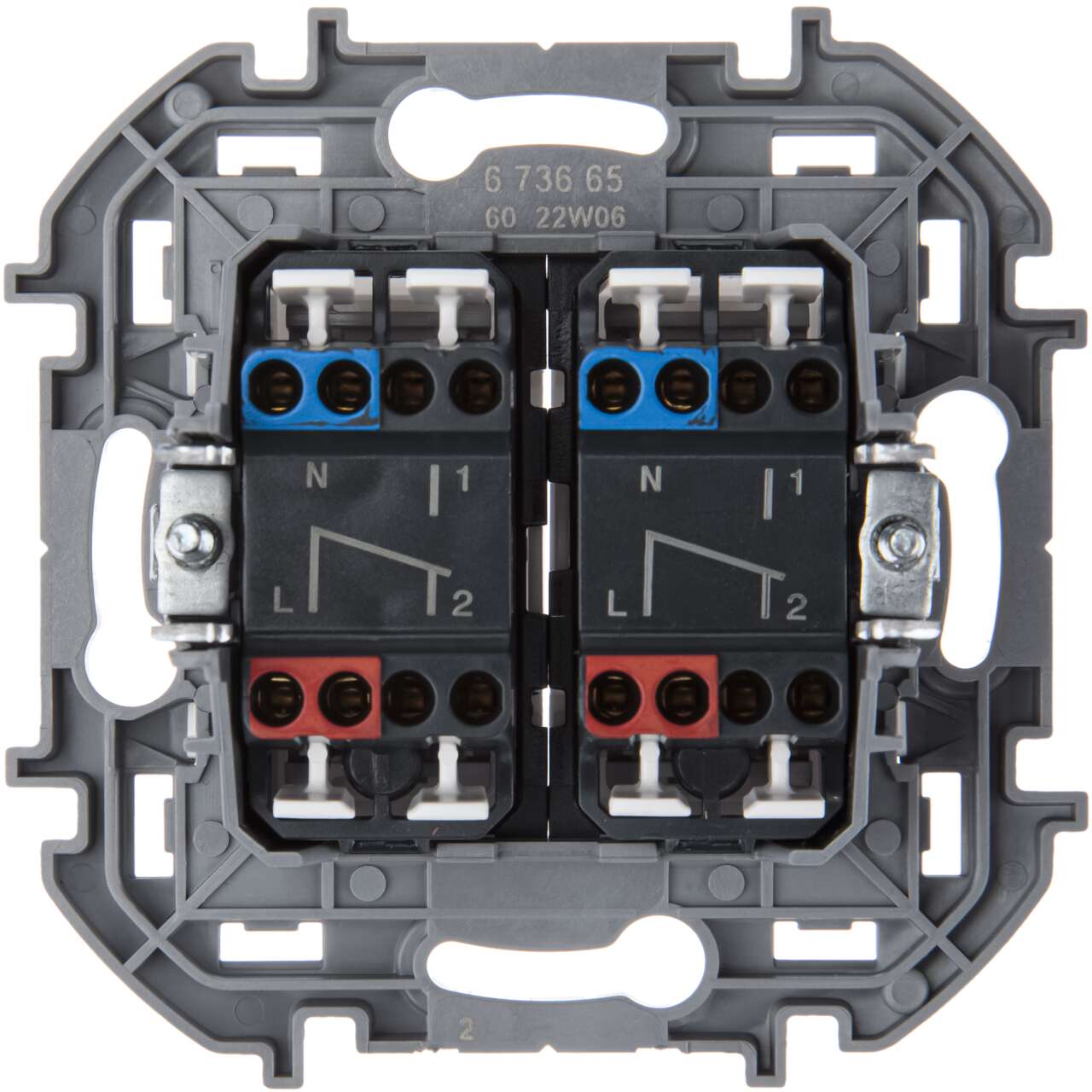 Переключатель модульный двухклавишный с подсветкой Inspiria для скрытого монтажа, цвет "Белый", номинальный ток 10 А, напряжение ~250В. Предназначен для установки в электрических сетях жилых и общественных зданий и используется для управления приборами освещения, вентиляции и т.д. Используется для независимой коммутации двух нагрузок. Подходит для управления с одного, двух или более мест. Оснащены двумя лампами для подсветки или индикации.