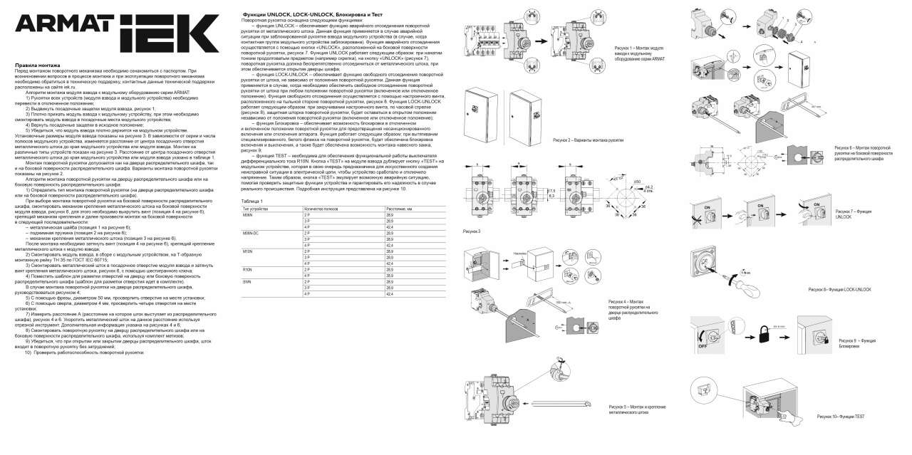 Наличие функции "UNLOCK". Функция «UNLOCK» обеспечивает функцию аварийного отсоединения рукоятки взвода от металлического штока. Данная функция применяется в случае аварийной ситуации при заблокированной рукоятке взвода модульного устройства (в случае, когда контактная группа модульного устройства заблокирована). Функция аварийного отсоединения осуществляется с помощью кнопкой «UNLOCK», расположенной на боковой поверхности поворотной рукоятки. Функция «UNLOCK», работает следующим образом: при нажатии тонким продолговатым предметом (например скрепка), на кнопку UNLOCK», поворотная рукоятка должна беспрепятственно отсоединиться от металлического штока, при этом обеспечивается открытие дверцы шкафа.