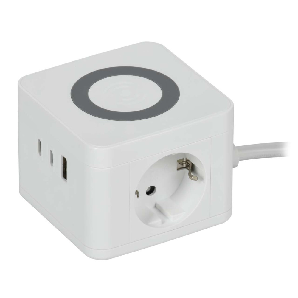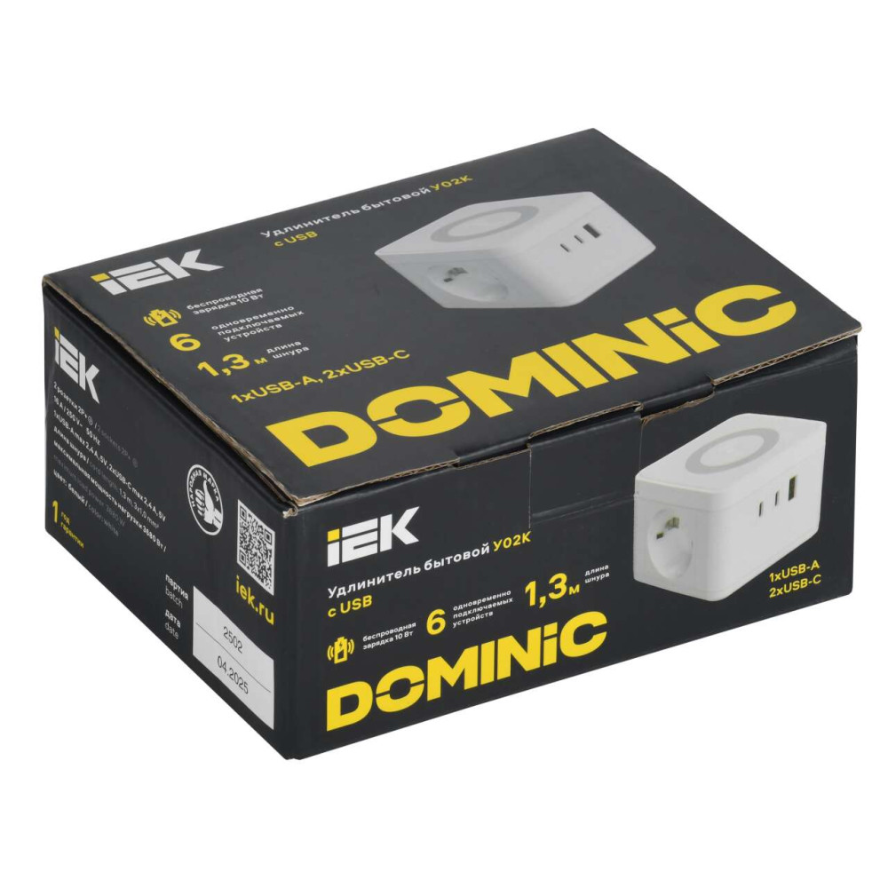 ОформитьDOMINIC Удлинитель с беспроводной зарядкой 10Вт У02К 2 места 2P+PE 1,3м 3х1,0мм2 16А/250В USB A+C белый IEK