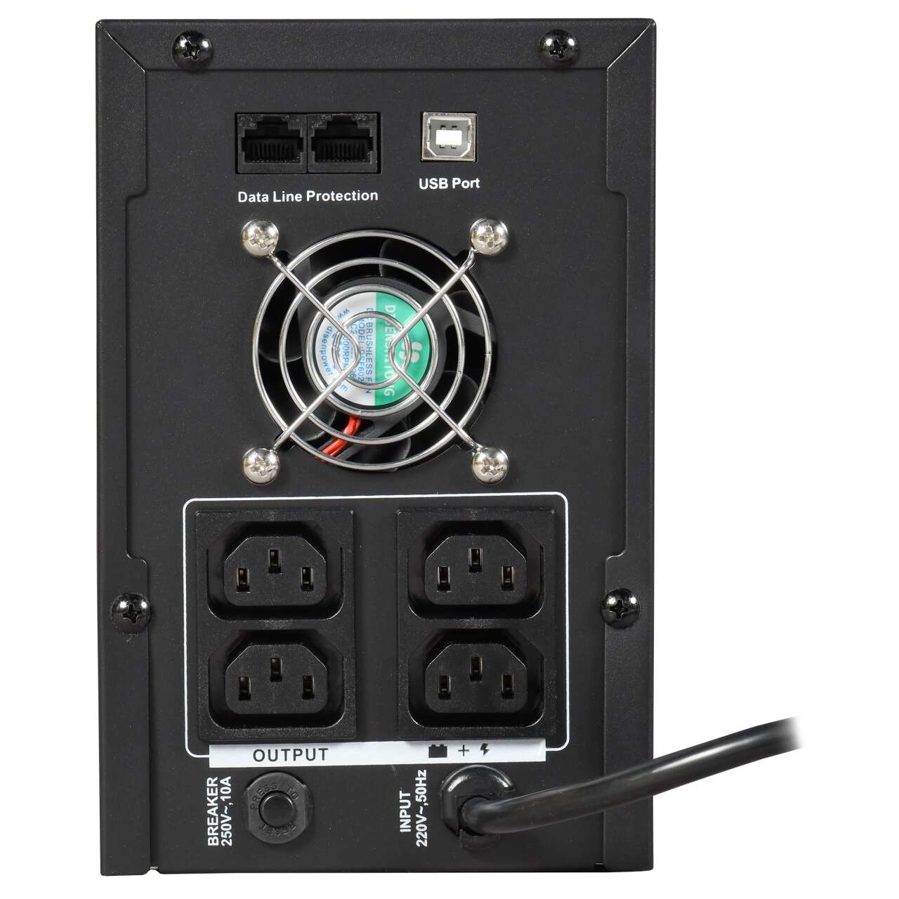 ИБП оснащен 4 разъемами С13 и USB разъемом. ИБП имеет встроенный АКБ 2 шт емкостью 7Ач.