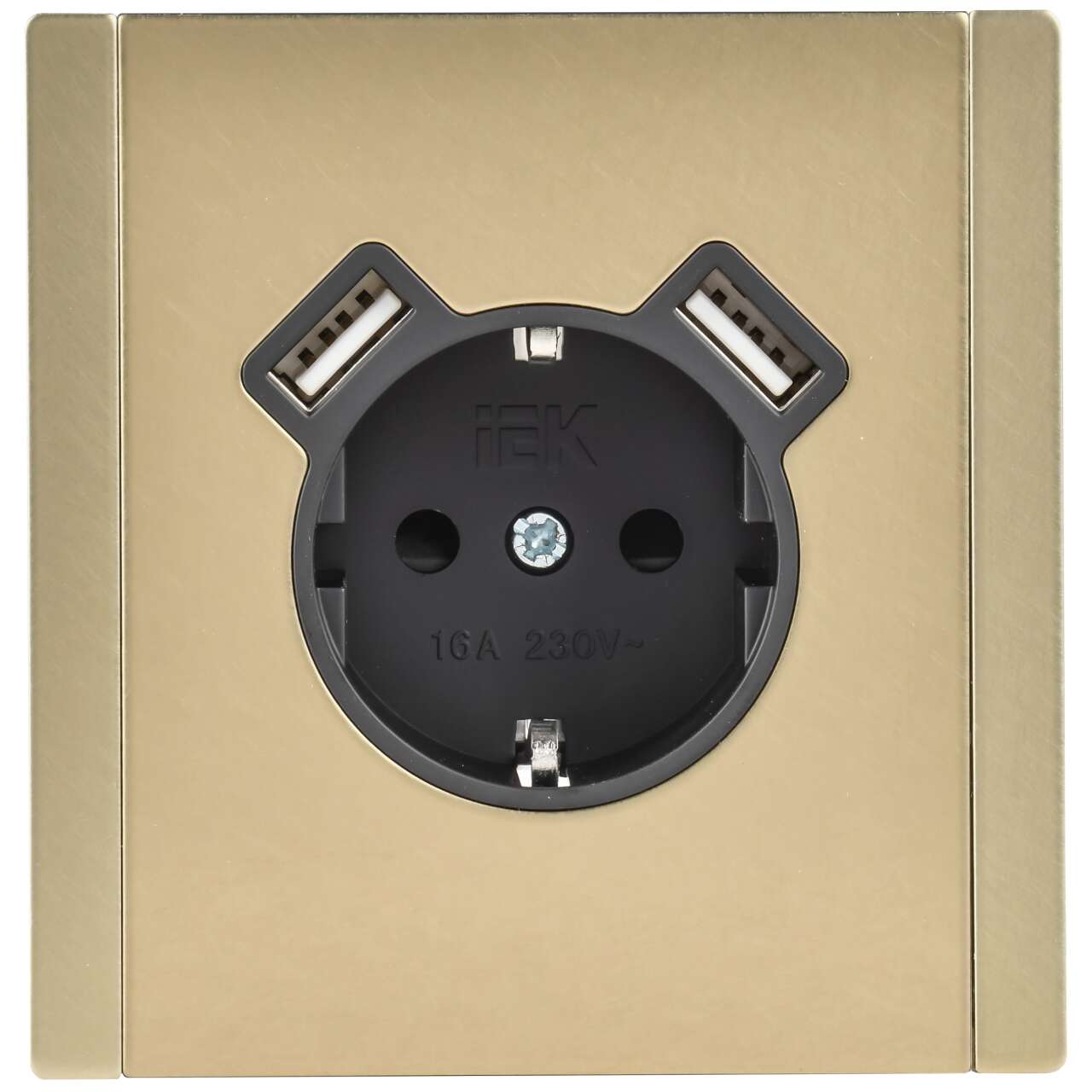 ОформитьFORTE&PIANO Розетка 1-местная с заземлением с защитными шторками винтовое крепление 16А USB A+A 3,1А FP645M металл шампань IEK