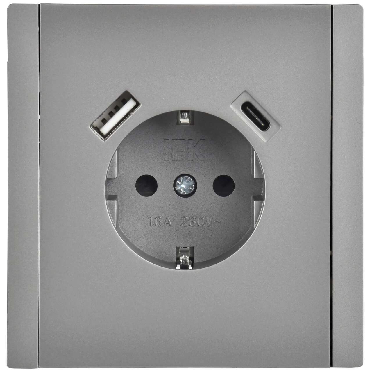 ОформитьFORTE&PIANO Розетка 1-местная с заземлением с защитными шторками винтовое крепление 16А USB A+C 18Вт FP547 сталь IEK