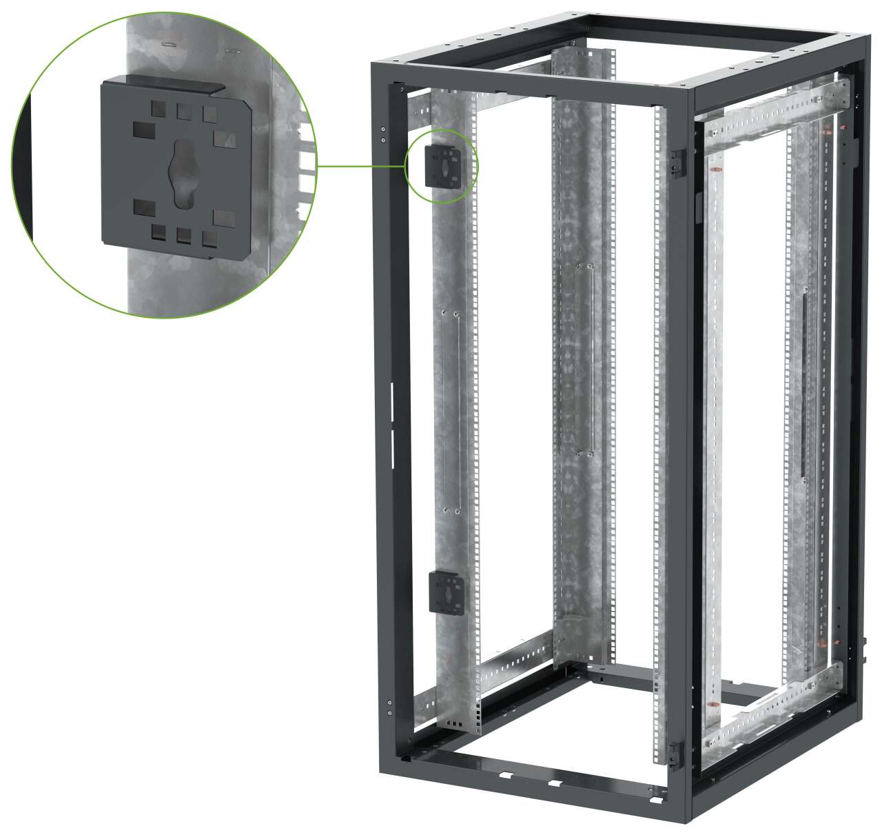 - - Имеют отверстия для безынструментального монтажа вертикальных PDU в зоне Zero-U