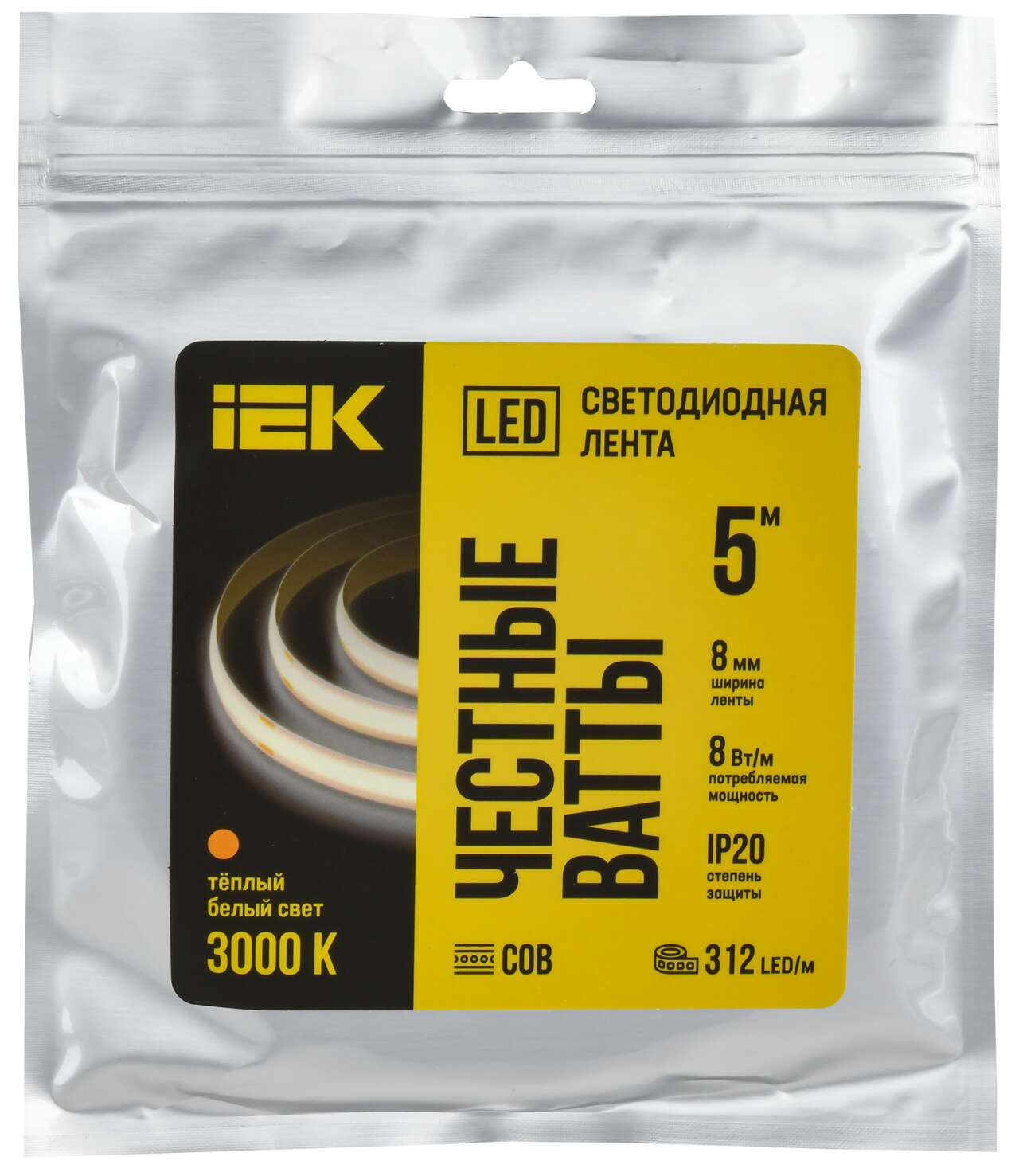 ОформитьЛента светодиодная 5м COB 312LED/м 8Вт/м IP20 ширина 8мм 24В теплый белый IEK