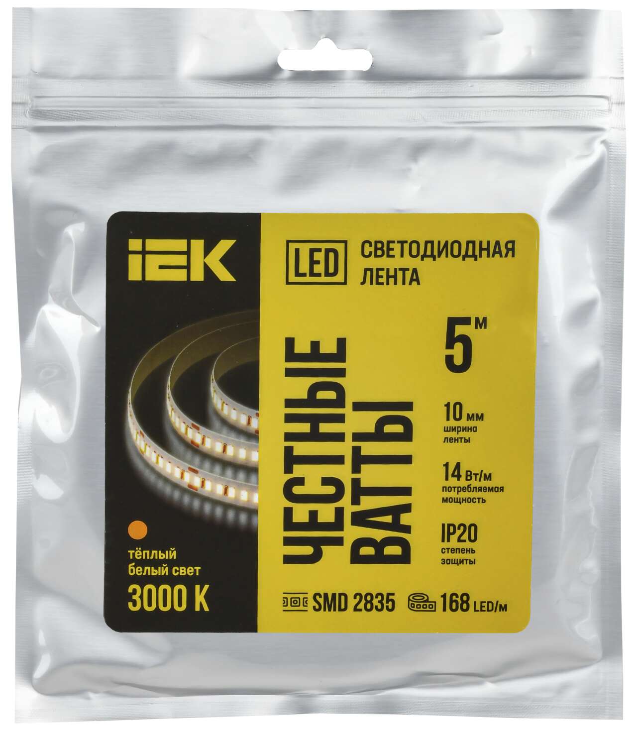 ОформитьЛента светодиодная 5м SMD2835 168LED/м 14Вт/м IP20 ширина 10мм 24В теплый белый IEK