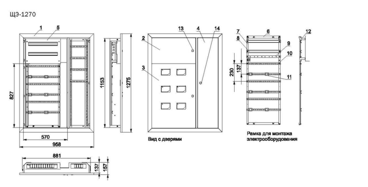 В вводно-учетном и распределительном отсеках в корпусах ЩЭ-Х-1 размещены перфорированные планки для крепления счетчиков (по количеству квартир), в корпусах ЩЭ-Х-6 установлена съемная монтажная панель. В вводно-учетном и распределительном отсеках размещены перфорированные планки для крепления счетчиков (по количеству квартир). Предусмотрена возможность установки в этом же отсеке аппарата отключения магистральной линии.