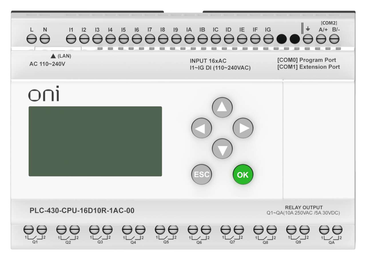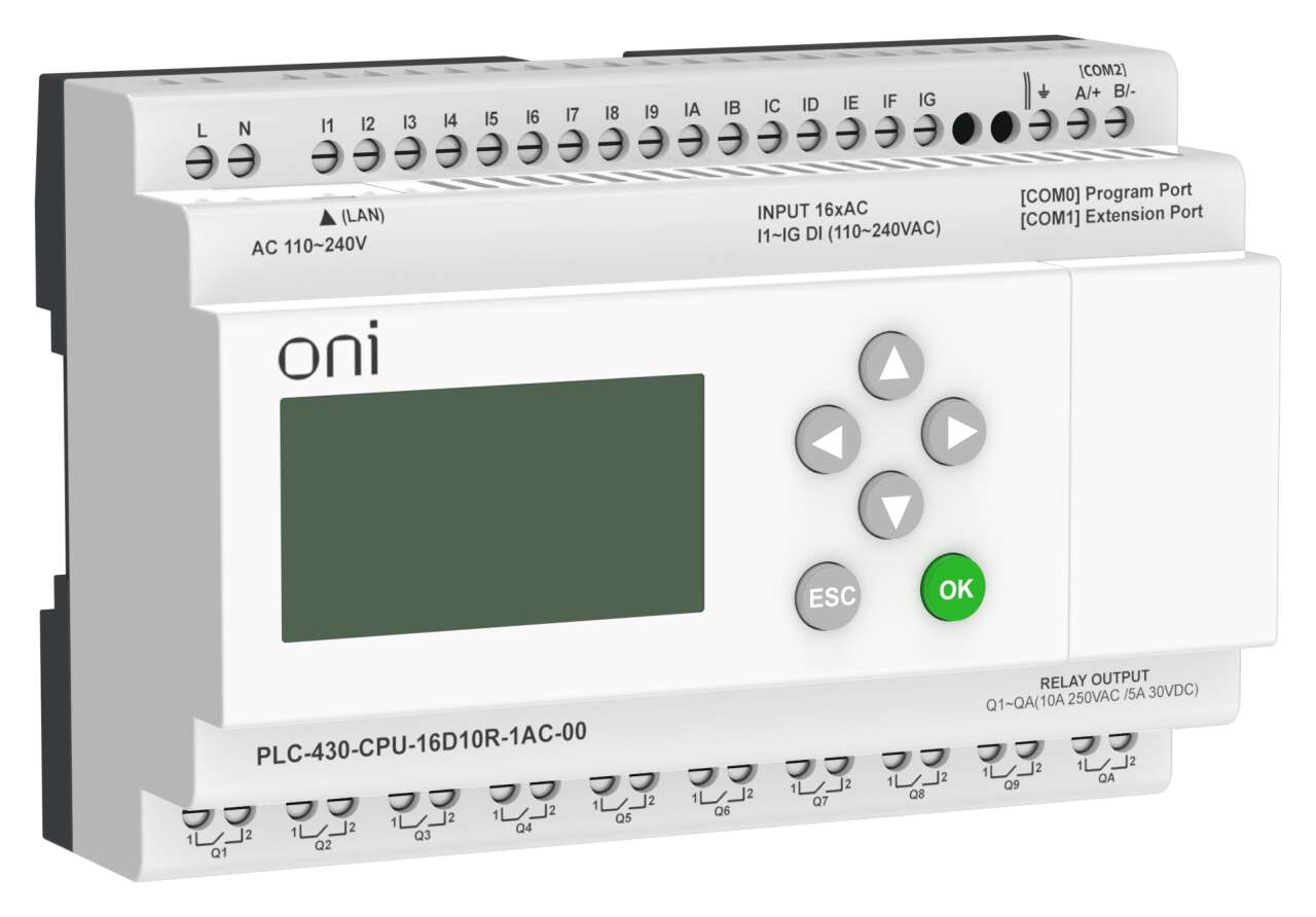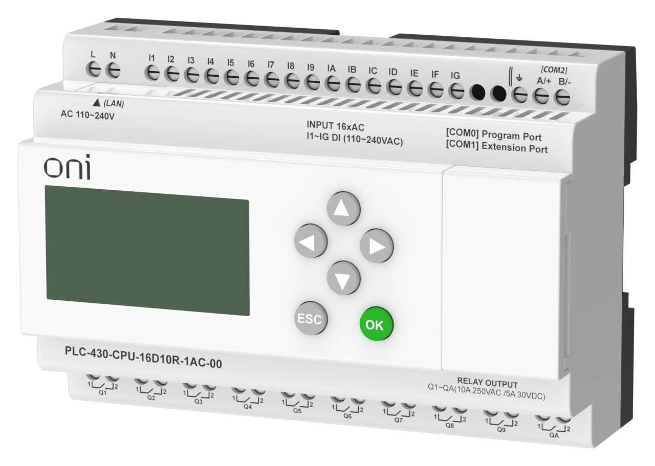 Модуль ЦПУ ПЛК 430 ONI с возможностью расширения количества каналов ввода-вывода и коммуникаций с помощью модулей расширения. С интегрированным полнофункциональным экраном. 16 дискретных входов и 10 релейных выходов. Интегрированы 1 интерфейс RS485, 1 интерфейс RS232 и 1 интерфейс Ethernet с поддержкой Modbus TCP/RTU/ASCII и MQTT протоколов. Напряжение питания 220В AC.