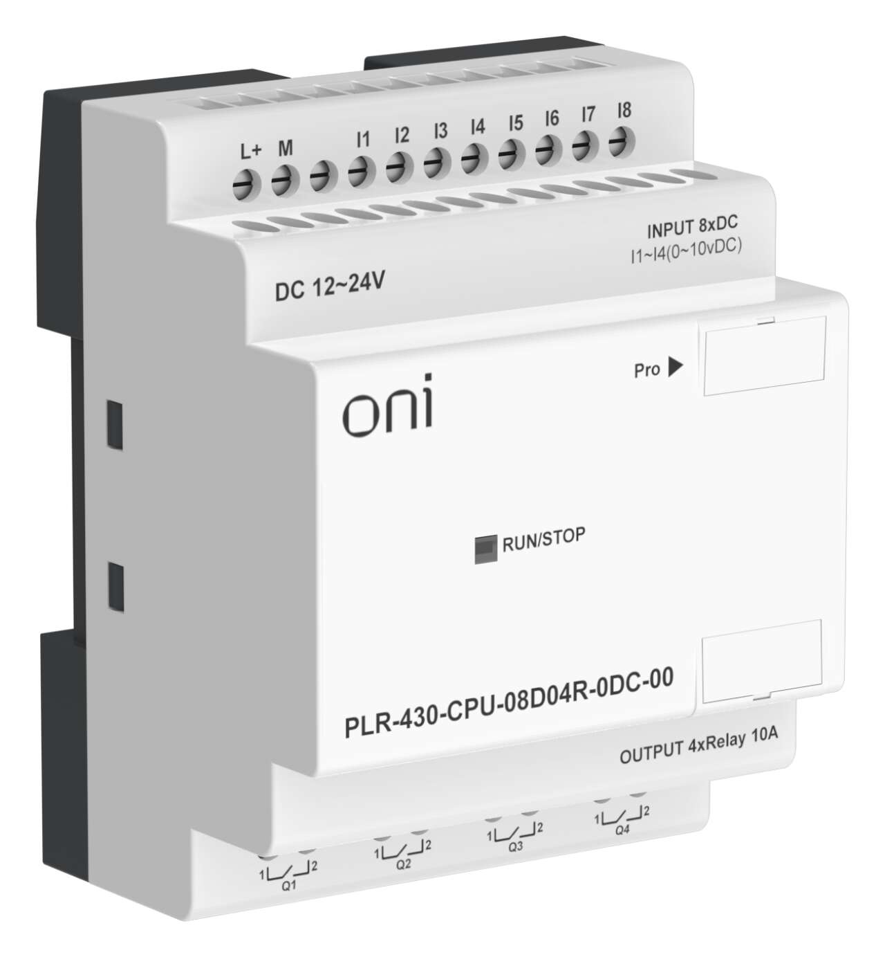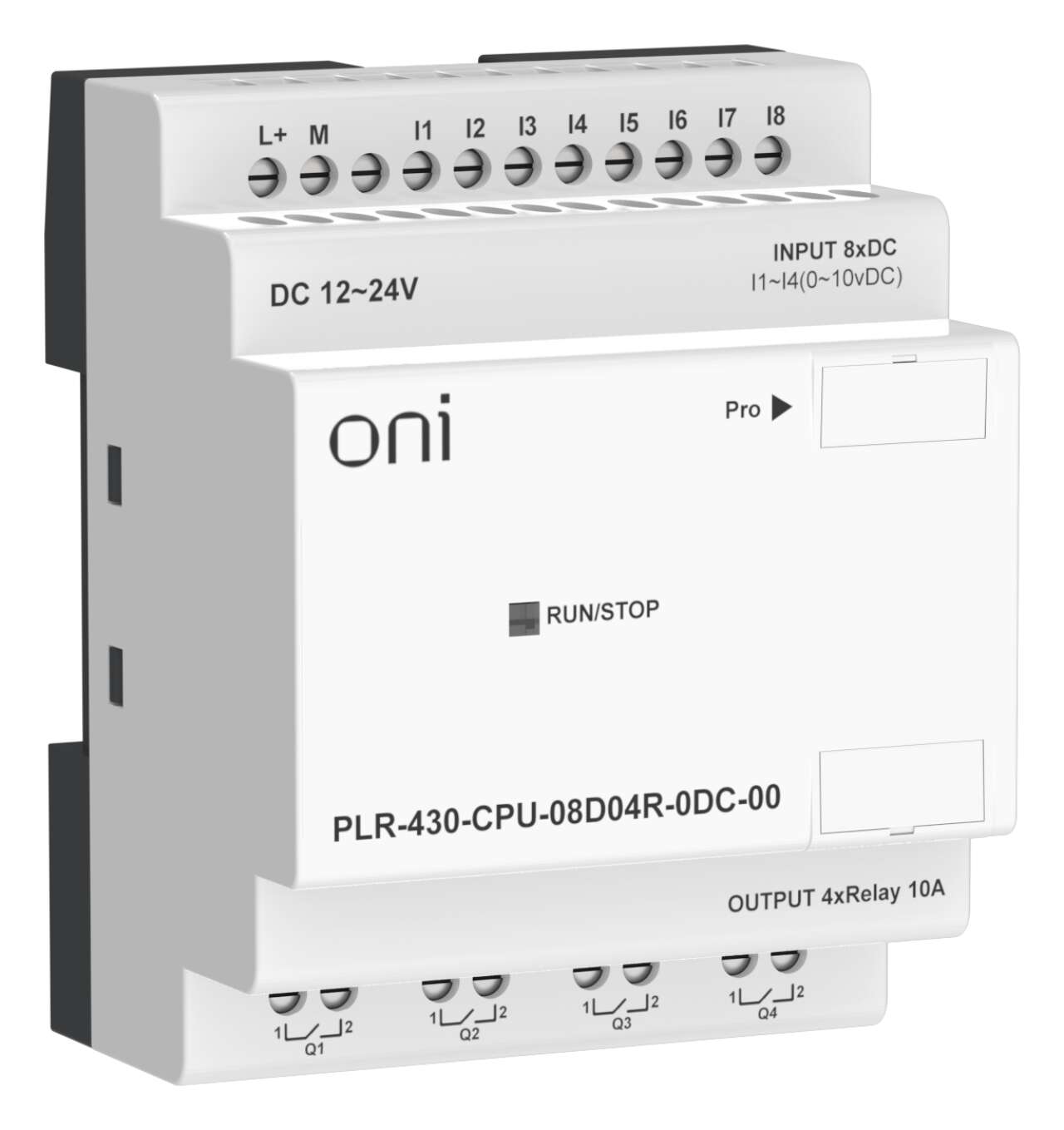 Модуль ЦПУ ПЛК 430 ONI без возможности расширения количества каналов ввода-вывода и коммуникаций. Без встроенного экрана. 8 дискретных входов, 4 из которых можно использовать как аналоговые 0..10В, и 4 релейных выхода. Интегрирован 1 интерфейс RS232. Напряжение питания 24 В DC.