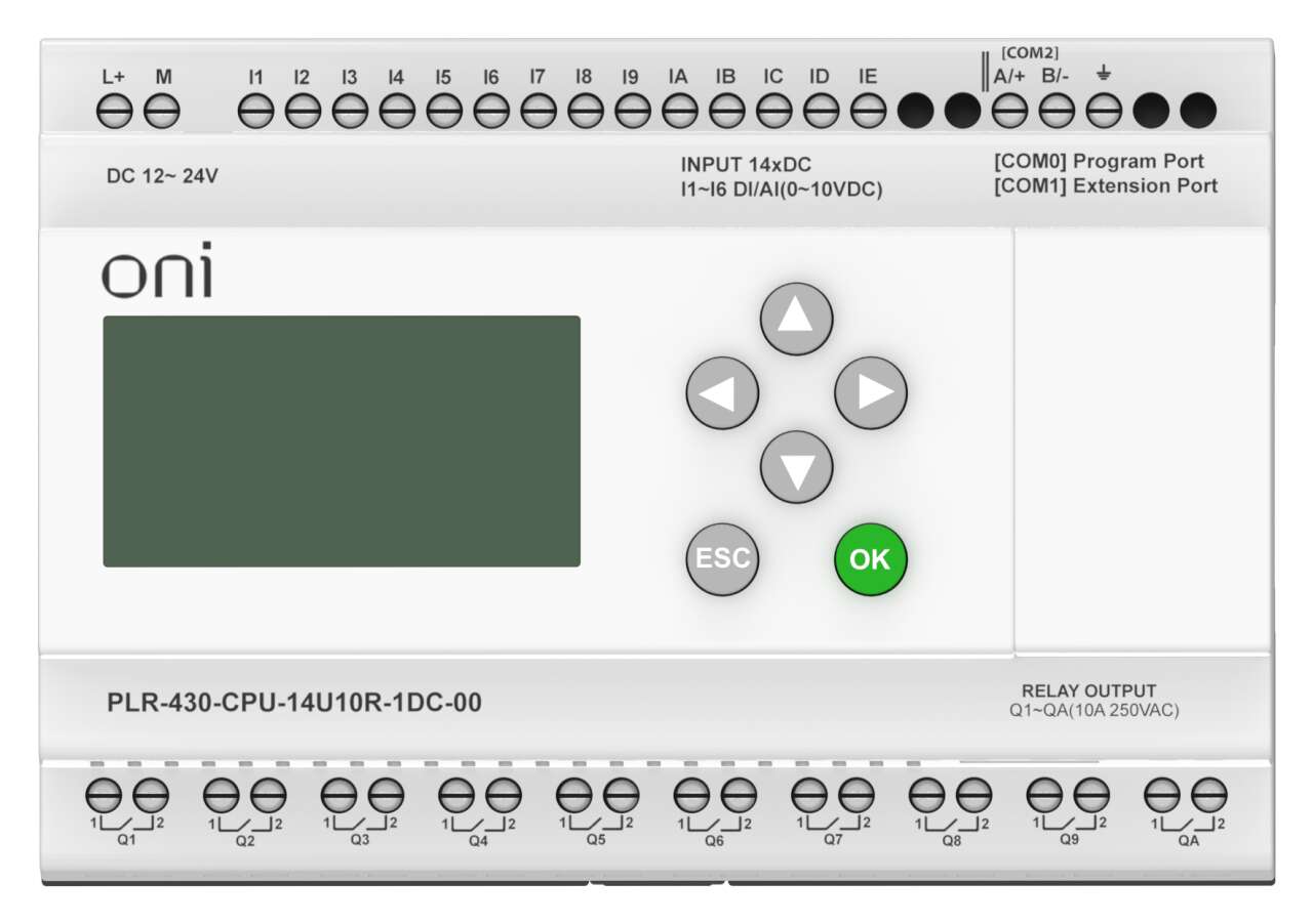 Модуль ЦПУ ПЛК 430 ONI с возможностью расширения количества каналов ввода-вывода и коммуникаций с помощью модулей расширения. С интегрированным полнофункциональным экраном. 14 дискретных входов, 6 из которых можно использовать как аналоговые 0..10В и 4 как высокоскоростные счетчики до 60кГц, и 10 релейных выходов. Интегрированы 1 интерфейс RS485 и 1 интерфейс RS232. Напряжение питания 24 В DC.