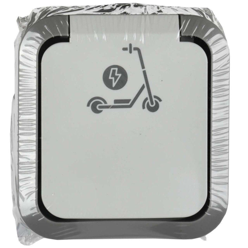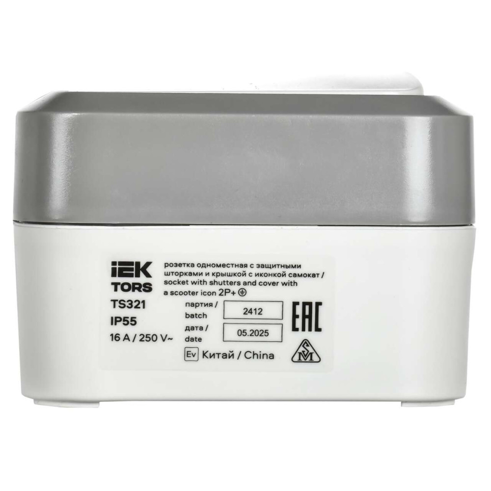 ОформитьTORS Розетка 1-местная с заземлением защитными шторками и крышкой с иконкой самокат 16А IP55 TS321 серо-белый IEK