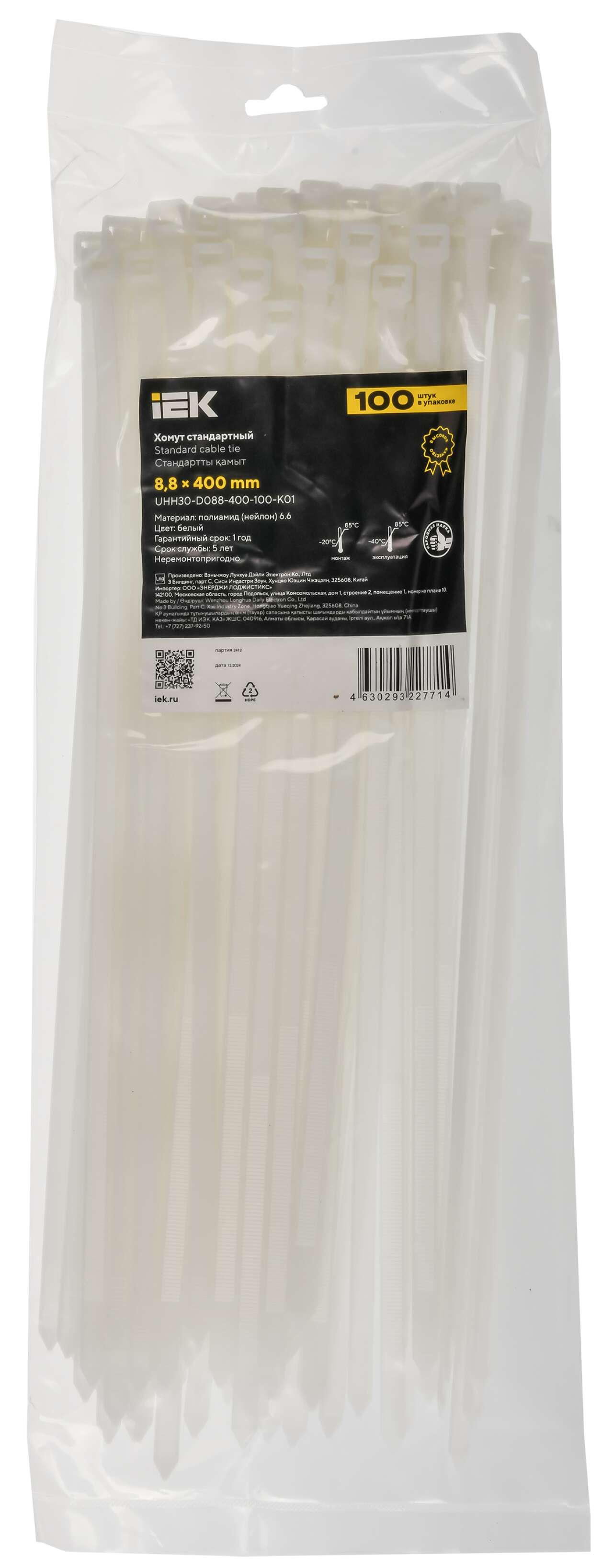 Хомуты стандартные предназначены для эффективной и безопасной фиксации кабелей и проводов в единый пучок, предотвращая их смещение и запутывание. Высокая прочность изделий и устойчивость к воздействию масел, смазок, растворителей позволяет применять их в различных условиях и температурных режимах. В ассортименте 3 цвета - белый, чёрный и серый.