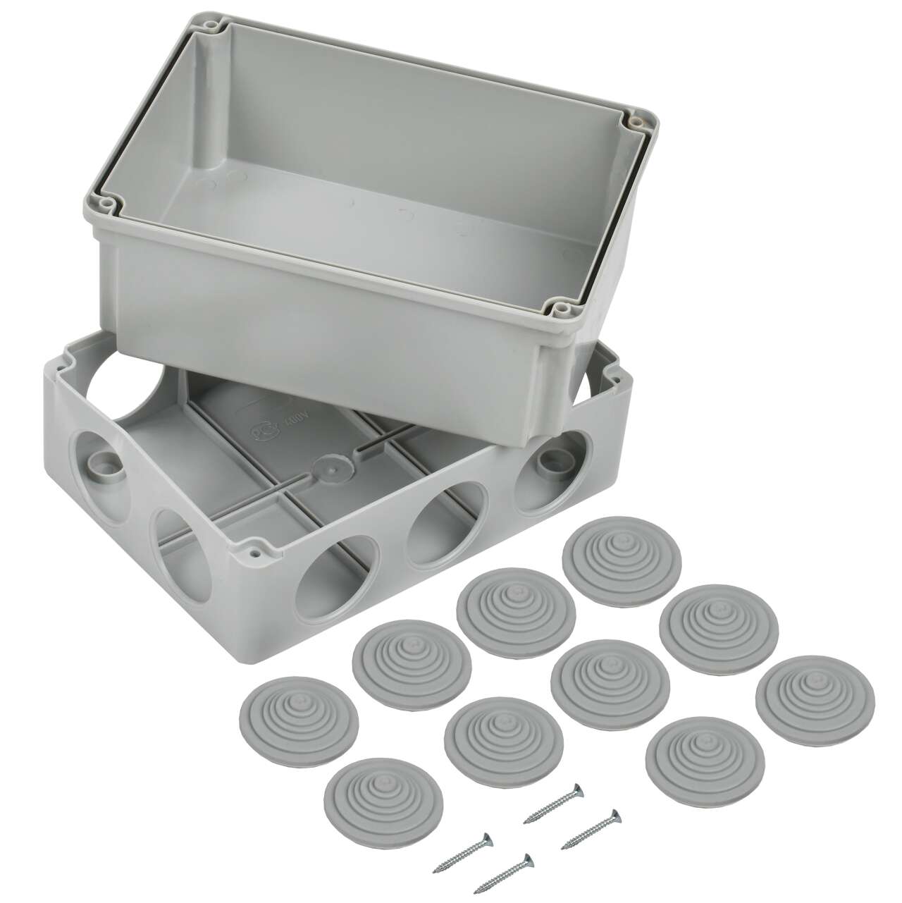 ОформитьКоробка распаячная КМ41246 для открытой проводки безгалогенная (HF) 190х140х120мм IP55 10 гермовводов серая IEK