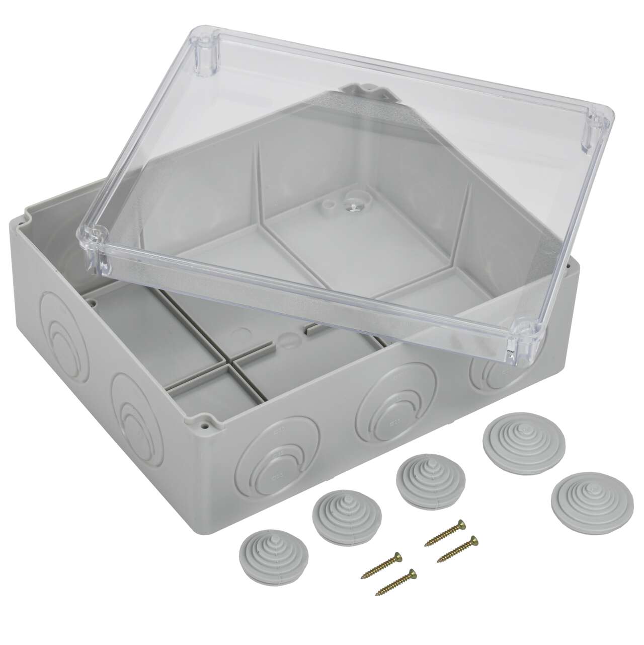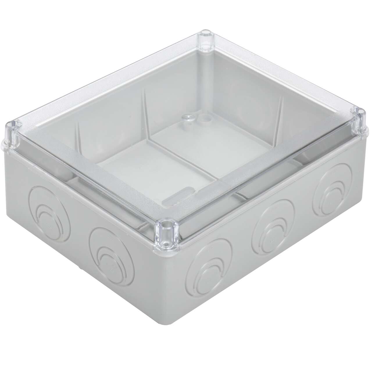 ОформитьКоробка распаячная КМ41275 для открытой проводки безгалогенная (HF) 240х195х90мм с прозрачной крышкой IP44 5 вводов RAL 7035 IEK