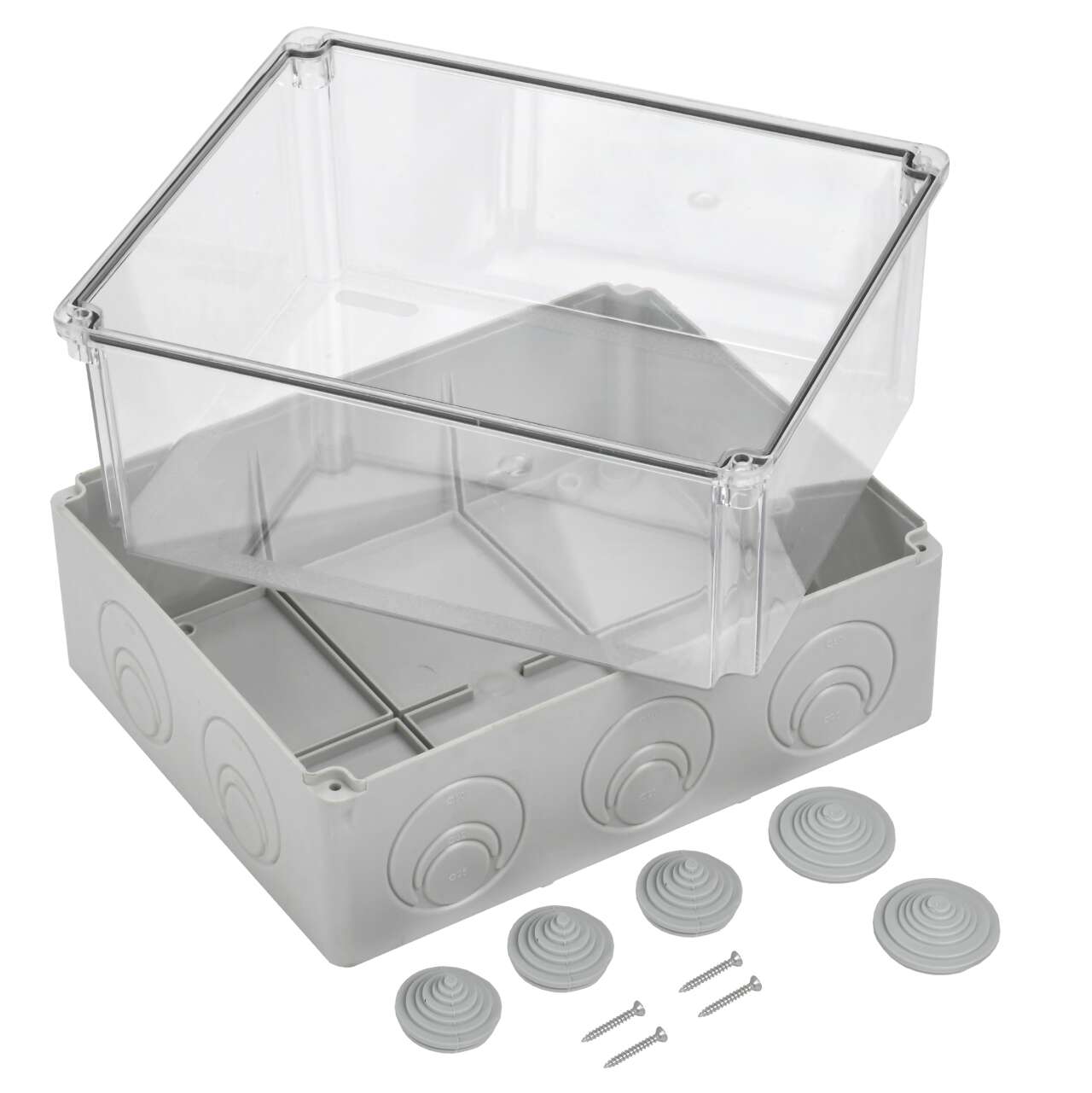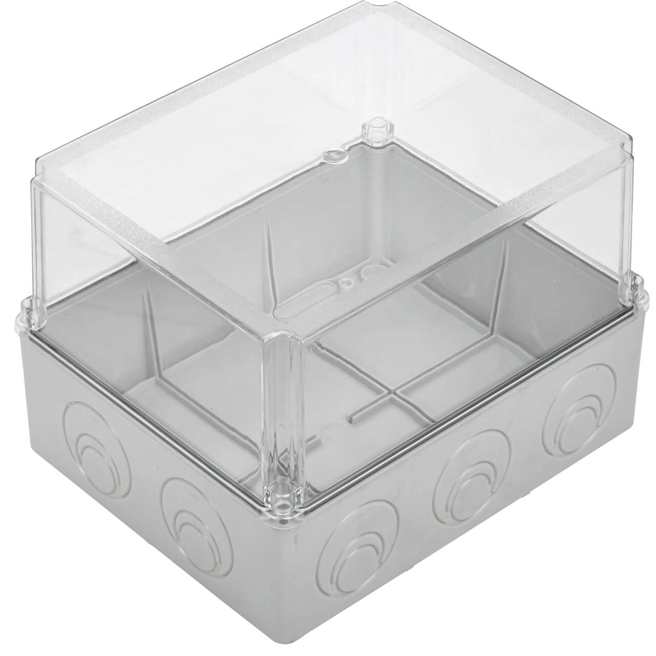 ОформитьКоробка распаячная КМ41278 для открытой проводки безгалогенная (HF) 240х195х165мм с прозрачной крышкой IP55 5 вводов RAL 7035 IEK