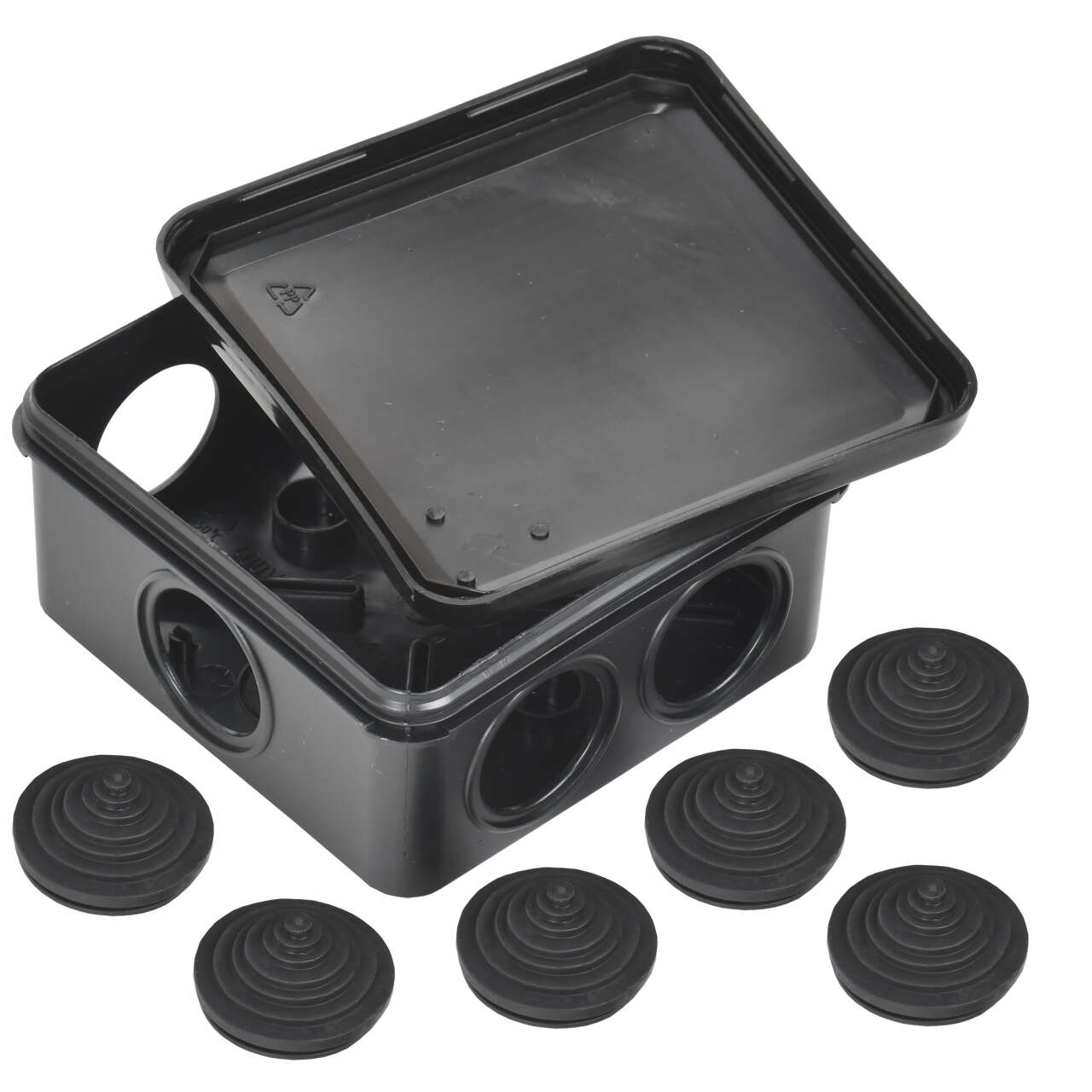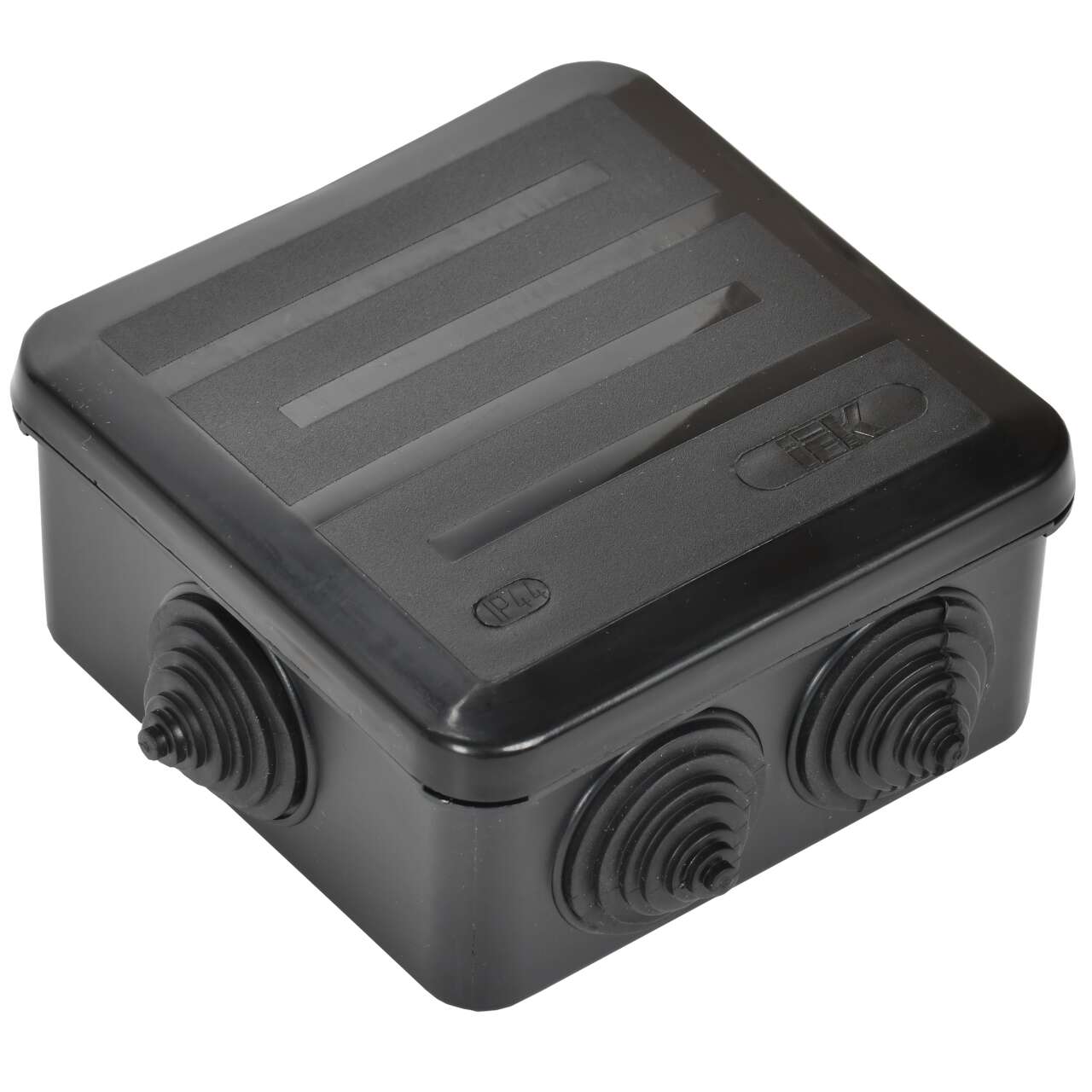 ОформитьКоробка распаячная КМ41255 для открытой проводки с защелкивающейся крышкой безгалогенная (HF) 100х100х50мм IP44 6 гермовводов черная (RAL 9005) IEK
