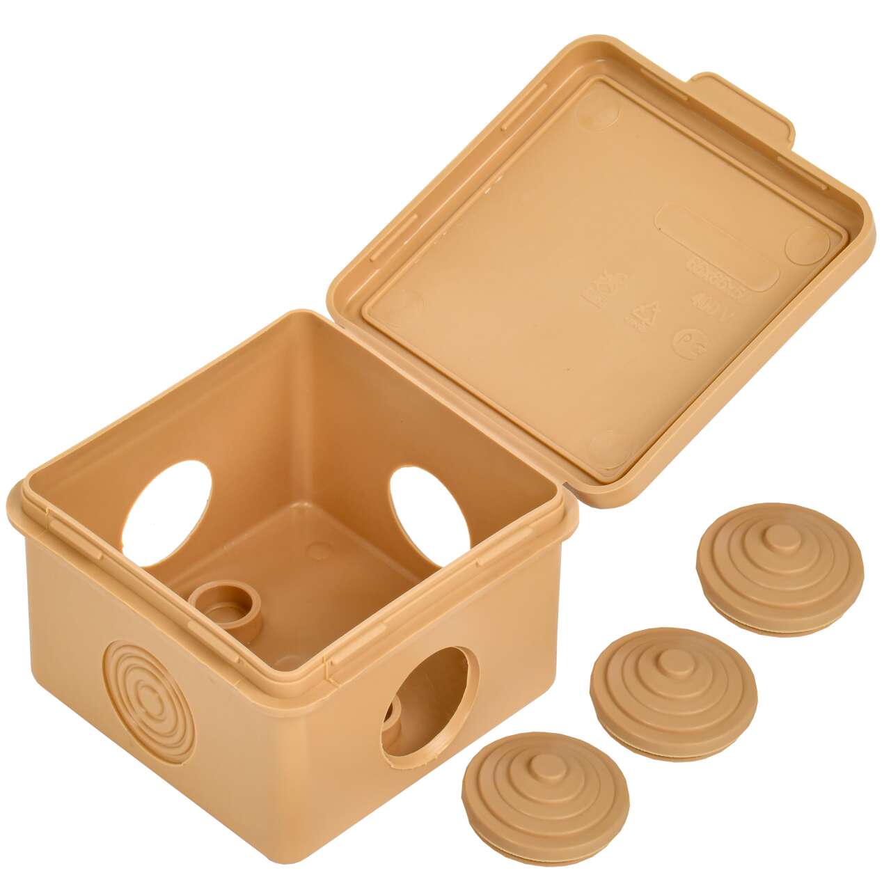 ОформитьКоробка распаячная КМ для открытой проводки с откидной крышкой 65х65х50мм IP54 4 гермоввода сосна IEK