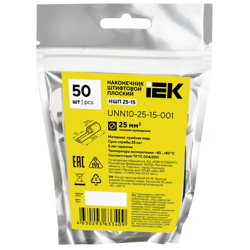 ОформитьНаконечник штифтовой плоский НШП 25–15 без изоляции IEK