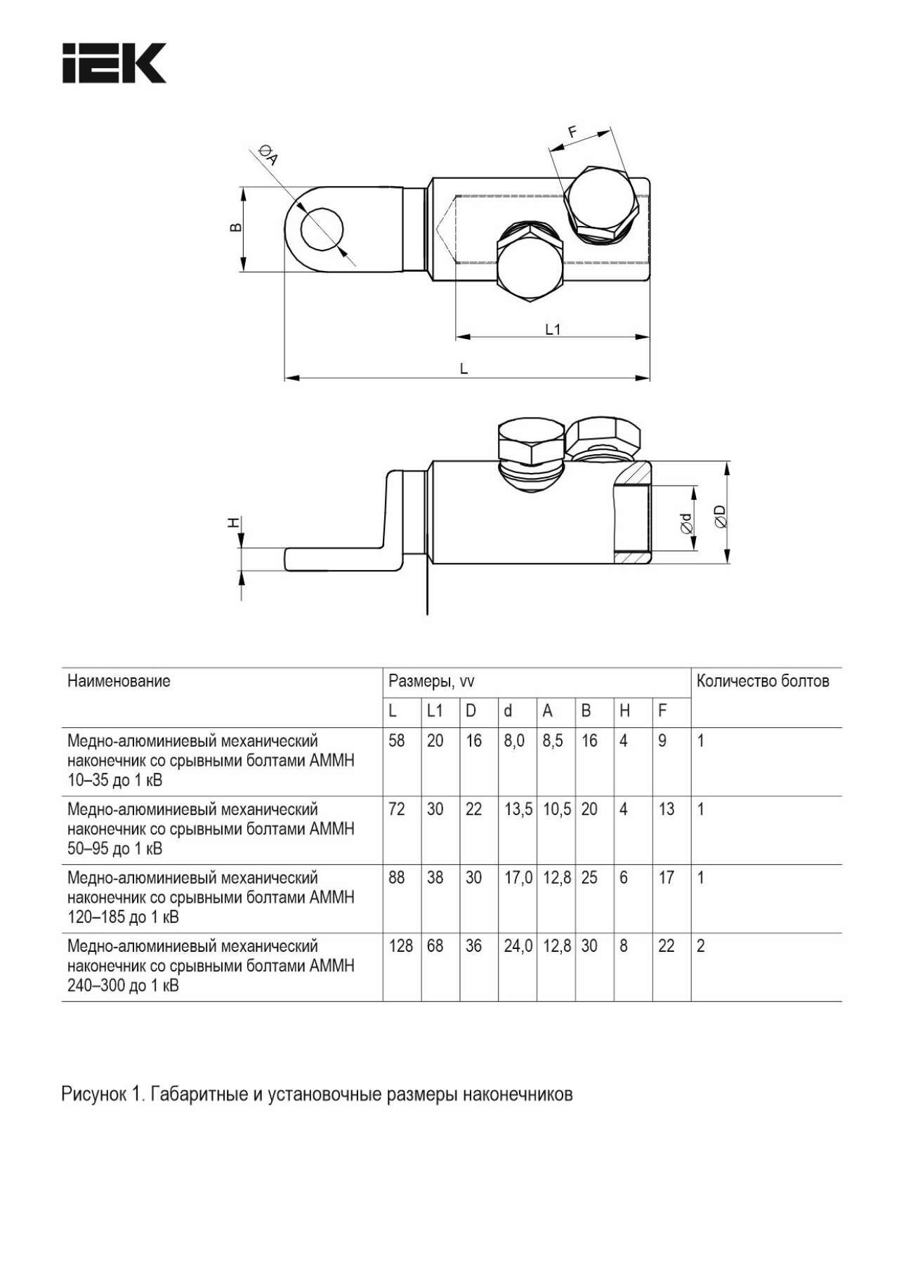 Наконечники серии АМН и АММН позволяют осуществлять соединение алюминиевых проводников с изделием с помощью гаечных ключей, не используя инструмент для опрессовки. Корпус наконечников изготовлен из алюминиевого сплава повышенной прочности. Предназначены для оконцевания затяжкой болтами предварительно зачищенных от изоляции алюминиевых проводов и присоединения к алюминиевым (АМН) или медным (АММН) клеммам, шинам, зажимам и т.п. Внутренняя поверхность изделий покрыта специальной пастой, увеличивающей проводимость контактного соединения, а также предохраняющей внутреннюю поверхность изделия от образования на ней тонкой оксидной пленки. Поперечная насечка и соответствующие болты улучшают механические и электрические свойства места соединения. Изделие может применяться как для однопроволочных, так и многопроволочных, круглых и секторных жил.